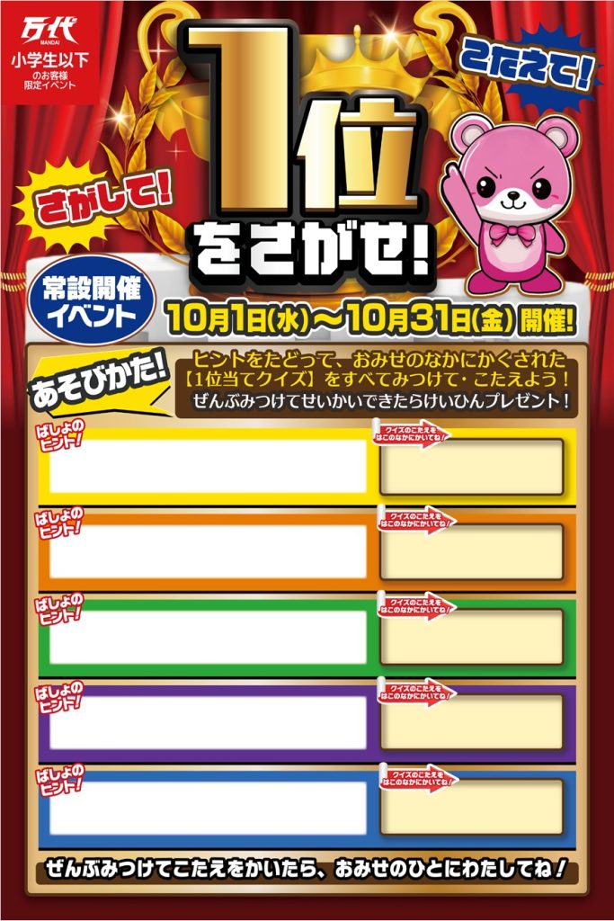 10/1~10/31 まで連日開催 【1位を探せ!】 探して答えて全問正解で景品ゲット!! ↓ 【今週末のイベントはこちら】 ↓