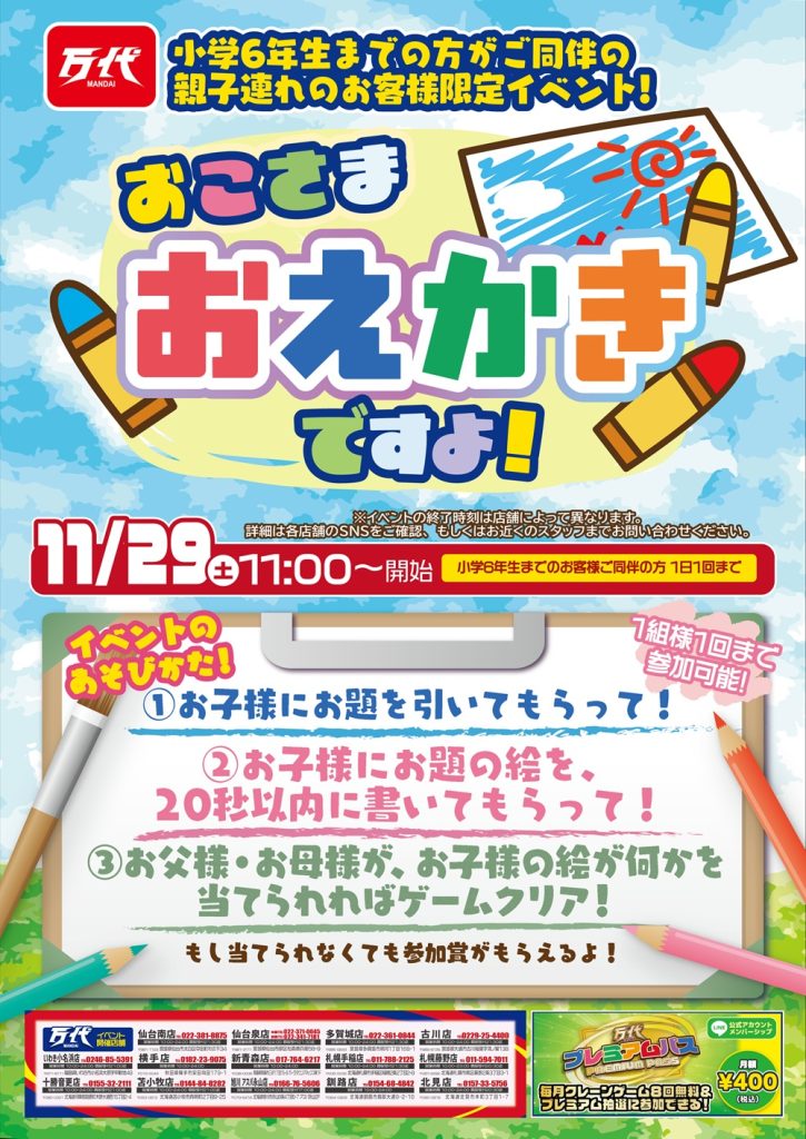 11/1~11/30 まで連日開催 【おえかきしましょう!】 おみせのなかにかくされたイラストをかくことができたら景品ゲット! ↓ 【今週末のイベントはこちら】 ↓